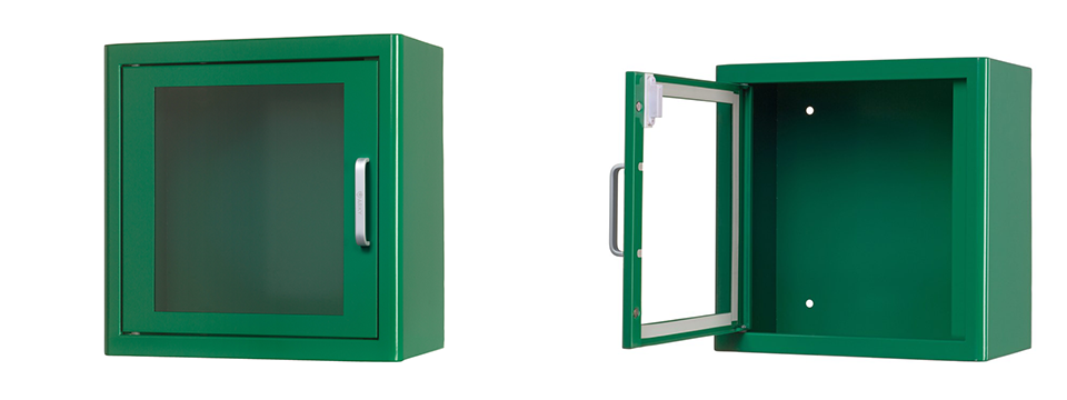- Defib cabinet manufactured from mild steel, coated with an outdoor yellow powder coat. Including a plastic wing handle for free opening, internal LED magnetic light that activates in darkness on a motion sensor, thermos statically controlled heating.